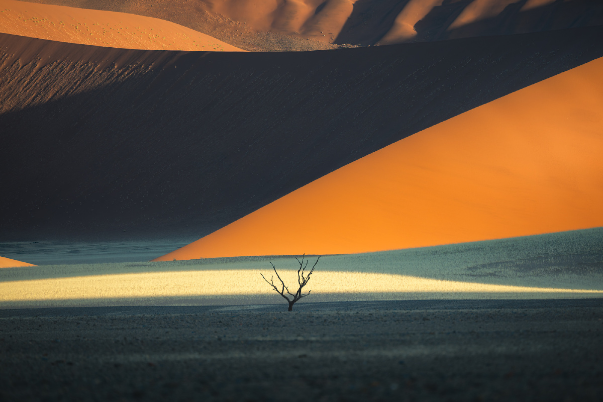 纳米比亚纳米布沙漠,富含铁元素的橙色沙丘与地面的沙粒的黄颜色形成了明显的反差。我在路边发现了一株枯死的植物,用长焦镜头记录下了沙漠中生命的痕迹,以及背后地理结构震撼的光影与色彩。 拍摄:尼康z6iii+100-400mm镜头 参数:iso200 f6.3 1/400s 400mm