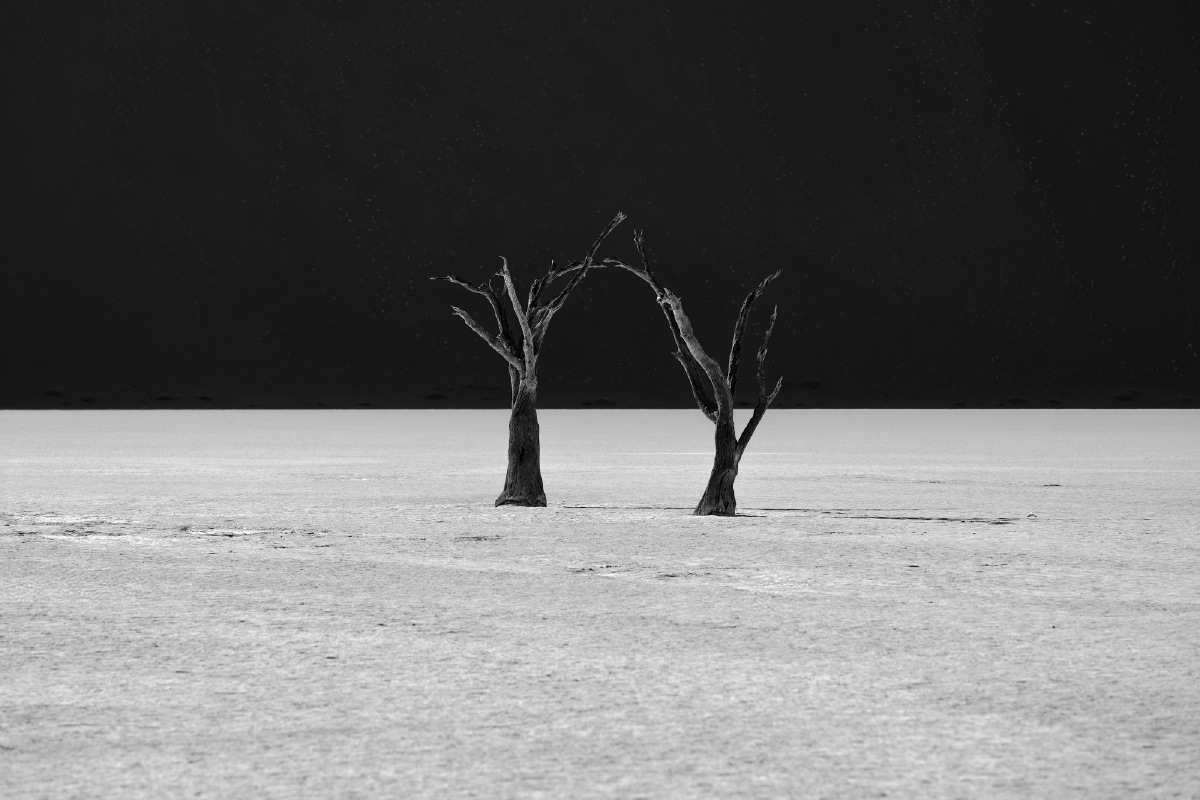 纳米比亚死亡谷,枯死的骆驼刺树因为极度干旱而一直挺立不朽,被阳光照亮的沙地和沙丘阴影组成了天然的明暗分界线。正好我发现几颗枯树,树干部分一片枯黑,而树枝部分因为受到沙地反光,反而显得比较亮。于是我调整相机高度,正好让亮的树枝背后是沙丘阴影,而暗的树干被沙地高光包围,从而拍到了这张阴阳交错的照片。