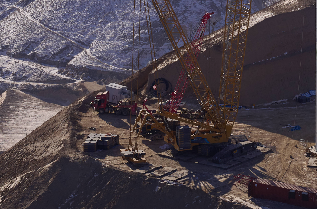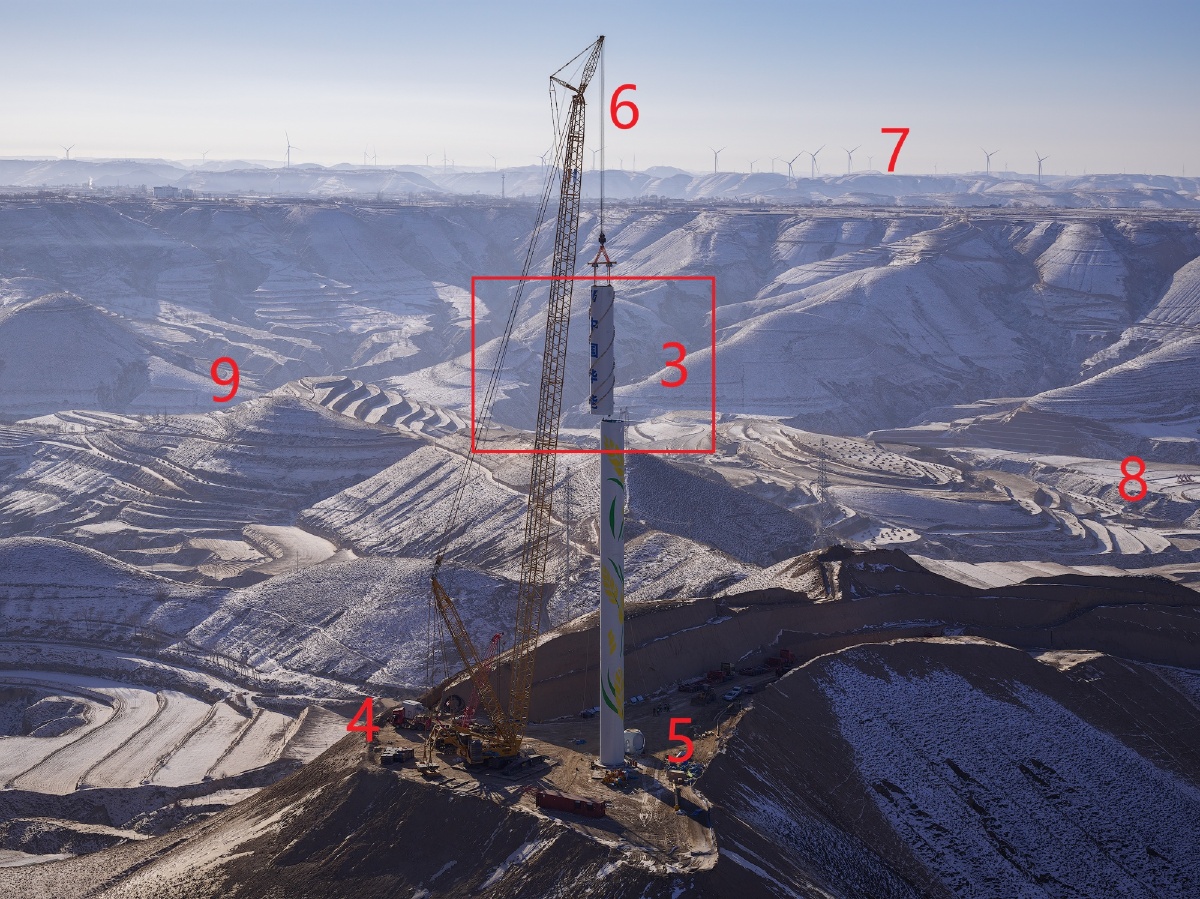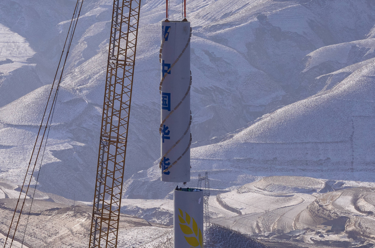 华能甘肃庆阳风光综合新能源基地,施工队正在吊装远景能源EN-200/5.56兆瓦变速恒频双馈风力发电机组的塔筒,背景是雪后的黄土高坡。