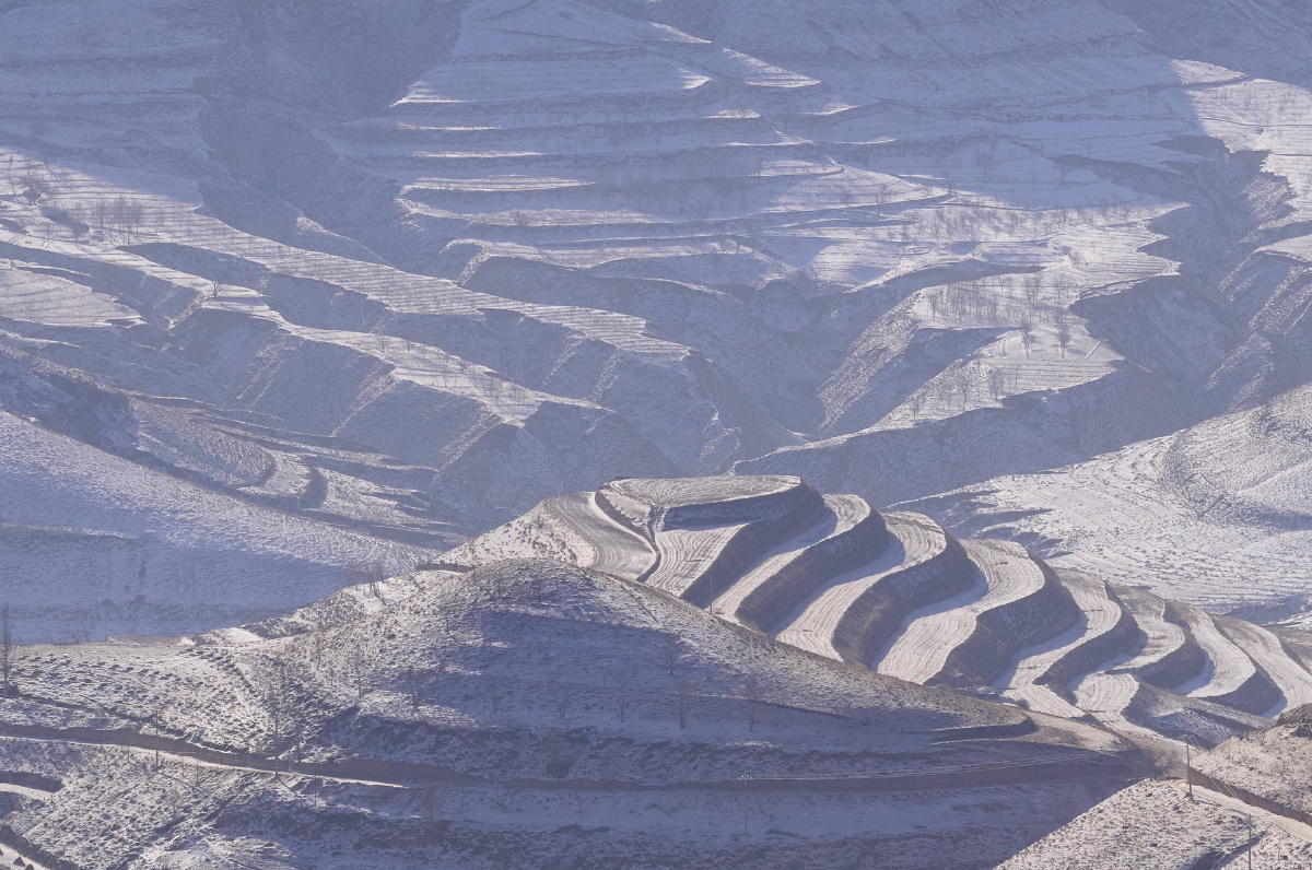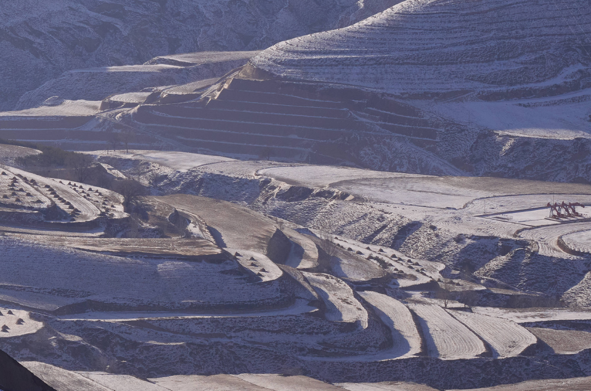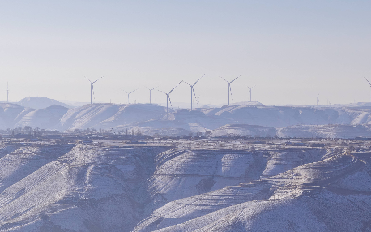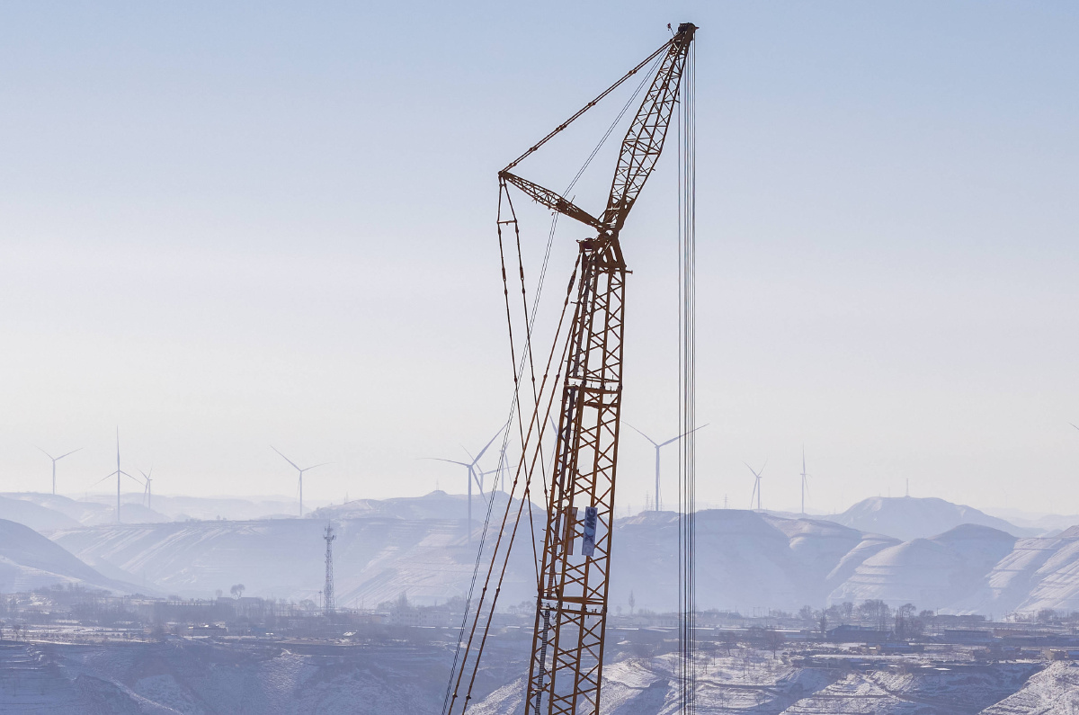 华能甘肃庆阳风光综合新能源基地,施工队正在吊装远景能源EN-200/5.56兆瓦变速恒频双馈风力发电机组的塔筒,背景是雪后的黄土高坡。