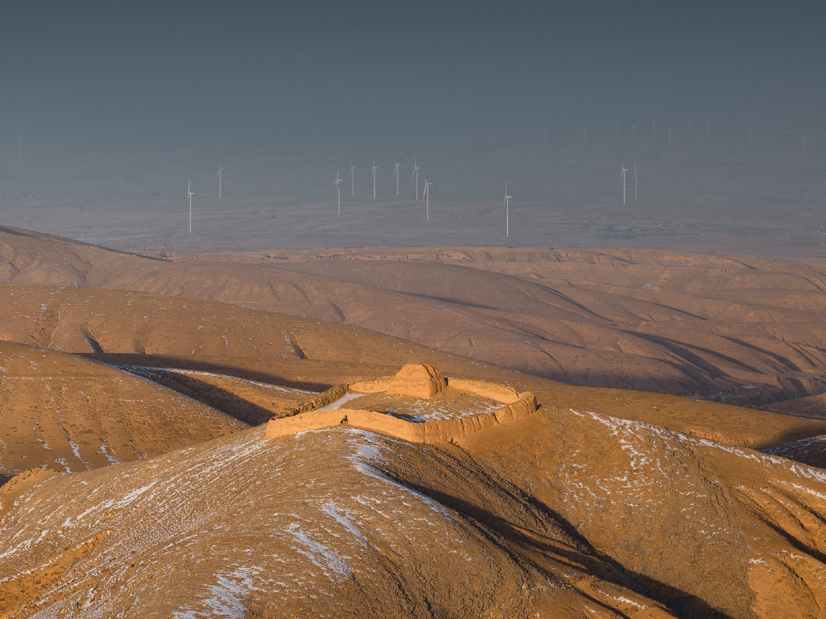 除了苍茫的黄土高原大地与遗迹之外,这次我用无人机还还拍到了现代风车与古长城同框的场景。周围数个在建和已建成的风电场,装机容量达到了数百兆瓦。连绵不绝的风车组成了新时代的能源长城,通过特高压输电网络向中国中东部地区源源不断的输送清洁的电能。