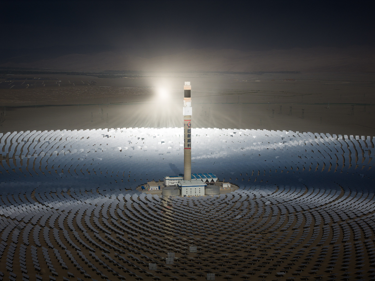 敦煌首航节能100兆瓦熔盐塔式光热电站,图中因为一整天下雨,到日落时分天空才放晴,因此电站没有将定日镜的光线对准中心聚光塔。 光热电站是通过反光镜(定日镜)将太阳光汇聚到中心吸热塔的吸热器,加热熔盐、导热油等传热介质,高温介质再将热量传递至蒸汽发生器产生高温高压蒸汽,蒸汽推动汽轮机旋转,带动发电机发电。光热电站配备储热系统,可储存多余热能,在无光照时持续发电,实现24小时稳定供电。