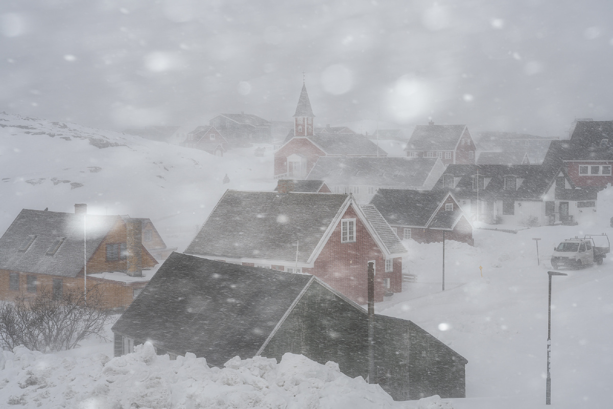 暴风雪中的格陵兰岛首都努克,厚厚的积雪覆盖路面,能见度极低。 对于摄影师而言这样的天气是非常难得的。虽然街头行人寥寥寒风刺骨,不过我还是抓起闪光灯和相机出门拍摄。 格陵兰岛不仅气候极为恶劣,同时也是地缘冲突与气候变化的热点地带。 拍摄:索尼A7CR 参数:70mm f10 iso50 1/125s