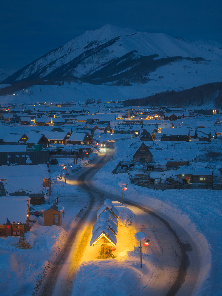 冬季新疆禾木的公交站台,温暖的灯光和蓝调时刻冷色的雪景形成了童话般的反差。 拍摄:御4Pro 参数:iso100 70mm f2.8 1/6s